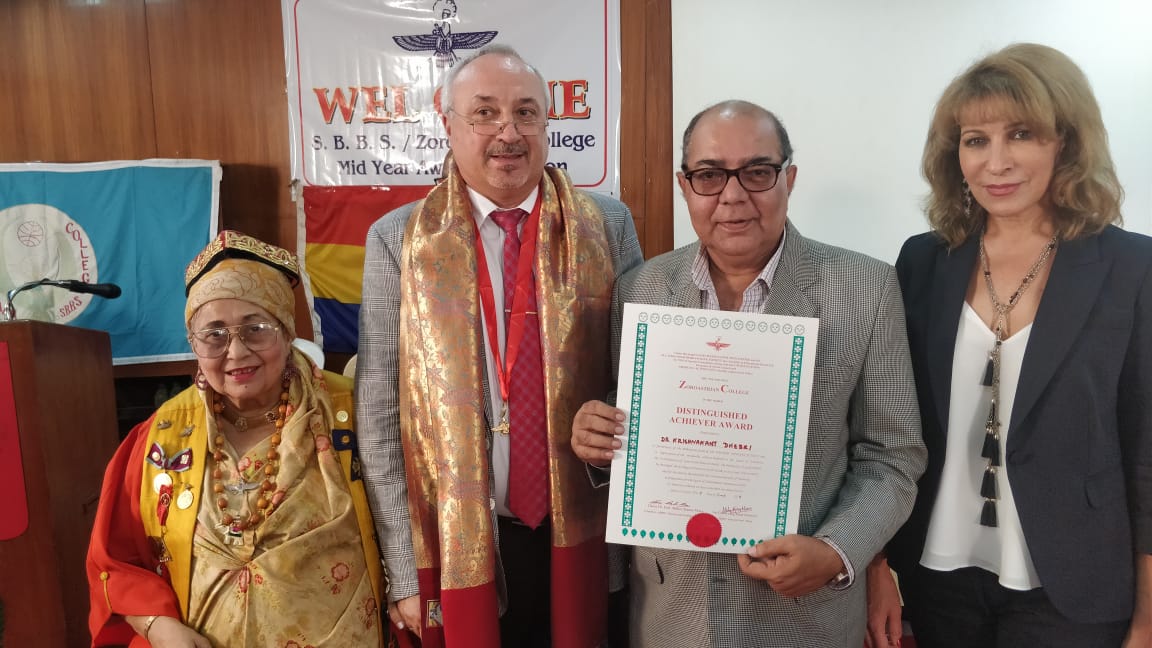 MUNA Hon. Secretary Dr K.R.Dhebri presented with "Distinguished Achiever Award" by Zoroastrian College President Dr.Prof Dame Meher Master-Moos, Russian Vice consul Sergei V Fandeev and MadameOksana Fandeev.