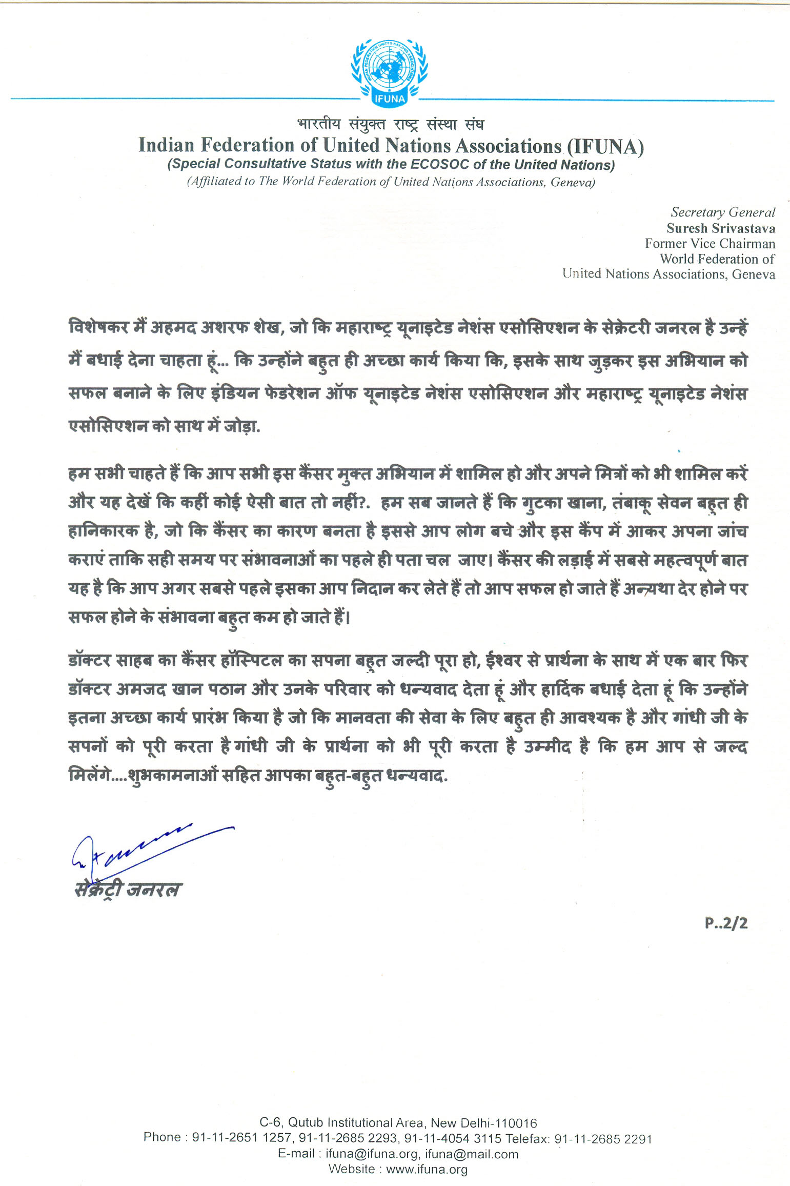 Shri Suresh Srivastava, Secretary General of Indian Federation of United Nations Associations (IFUNA) sent a special video and written message for this occasion which was played at the beginning of the function.