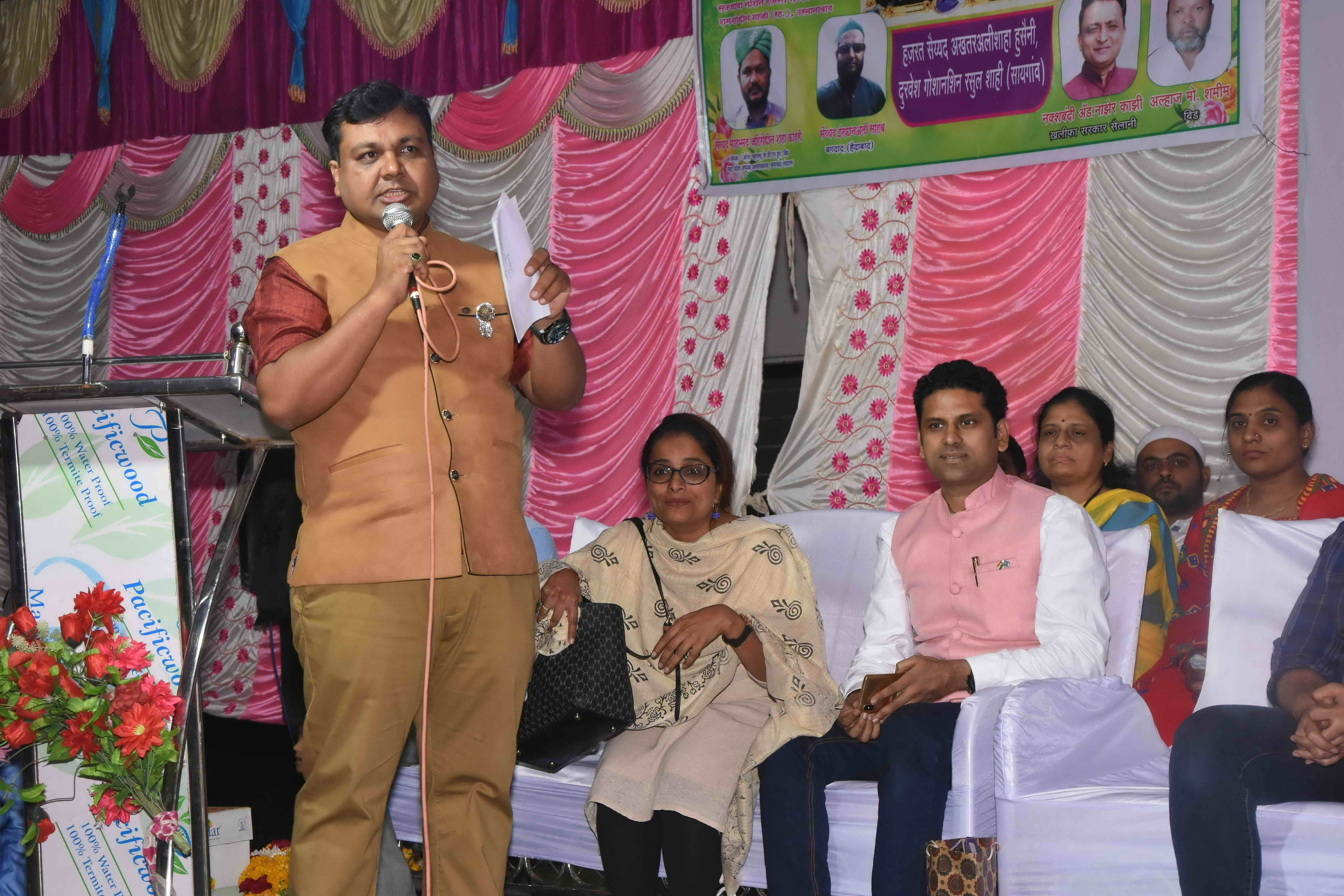 Mr. Ashraf Ahmed Shaikh, during his address, congratulated the organisers and wished everyone on behalf of Maharashtra United Nations Association (MUNA) and Indian Federation of United Nations Associations (IFUNA) and said that, “The work of Alhaj Asad Baba, Dr. Amjadkhan Pathan and their entire family is commendable as they have devoted their lives for the welfare of mankind, they are actually working at grass root level and struggling to reach the unreachable, this the real social work they are doing which I realise after coming and watching myself here in this district. This work needs to highlighted and I urge the Government of Maharashtra and Government of India to take note of the same to provide all the best possible help to them in order to enable them to expand their work so that it reaches to the masses.” He further added that, “The District of Buldhana is a pious land as it is the birth place of Hon’ble Jijabai (Jijamata) mother of Chattrapati Shivaji Maharaj and Asad Baba and his team is carrying out the social activities for poor since last 40 years. The work of national integration and communal harmony is very much needed for nation building and peace.”